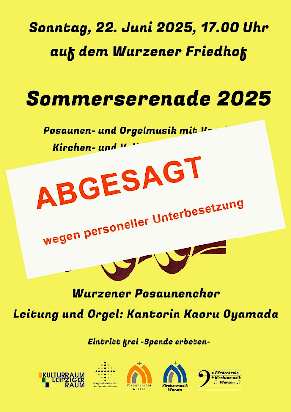 Es muss leider mitgeteilt werden, dass die Sommerserenade 2025 um 17 Uhr auf dem Wurzner Friedhof abgesagt werden muss. Dies ist auf eine personelle Unterbesetzung zurückzuführen.
