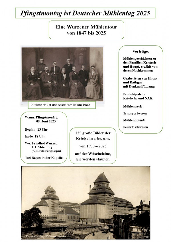 Wir laden Sie herzlich zu einem Vertrag anlässlich des Deutschen Mühlentages am 09.06.2025 von 13 bis 18 Uhr auf dem Friedhof in Wurzen ein.